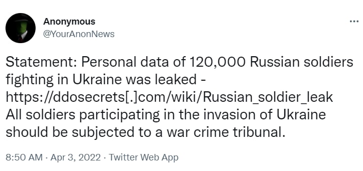 - Datele personale ale militarilor ruși, puse la dispoziție de către Anonymous, cuprind: data de naștere, numele acestora, adresele lor și nu numai.