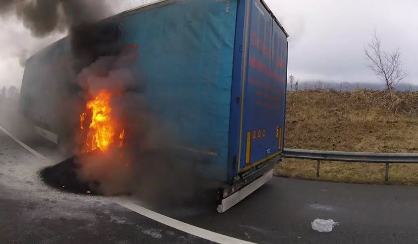Camion românesc în flăcări pe o autostradă din Austria. Mii de litri de apă au fost necesari pentru a stinge camionul aprins condus de șoferul român. Anvelopele de pe ultima punte a semiremorcii au explodat și imediat focul a cuprins vehiculul, scrie Meinbezirk, citat de Libertatea.