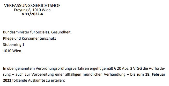 În cursul examinării măsurilor corona, Curtea Constituțională (VfGH) a găsit câteva neclarități și astfel a trimis întrebări Ministerului Sănătății.