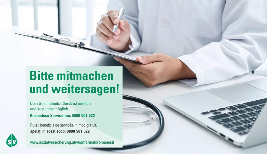 Români în Austria – Sănătatea românilor în Austria – Controlul stării de sănătate poate fi efectuat o dată pe an, în mod gratuit, de către toţi oamenii care locuiesc în Austria şi au împlinit vârsta de 18 ani.