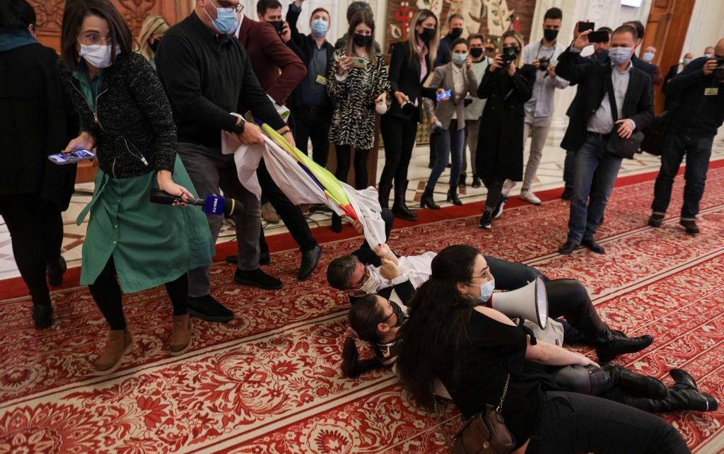 Protest în Parlament în timpul votului de învestire a Guvernului Ciucă