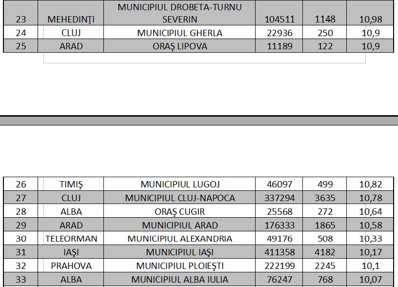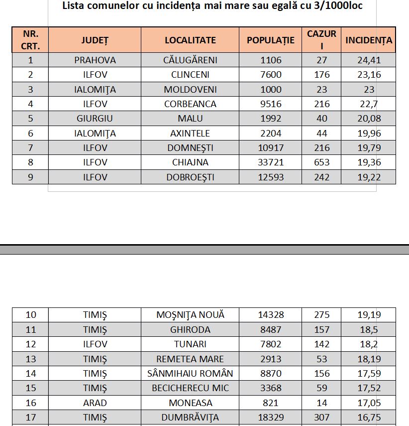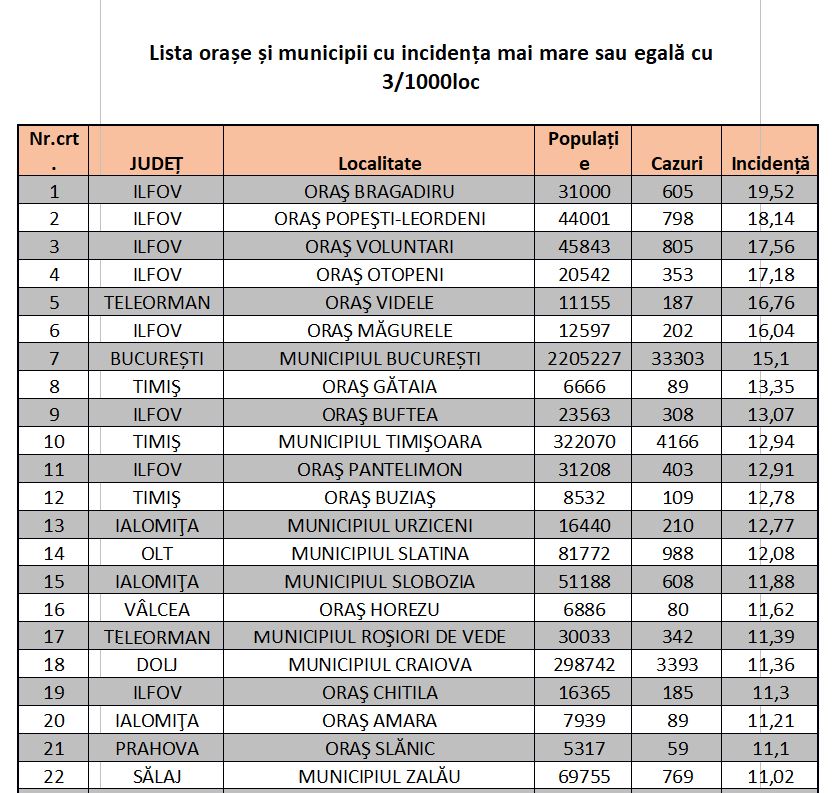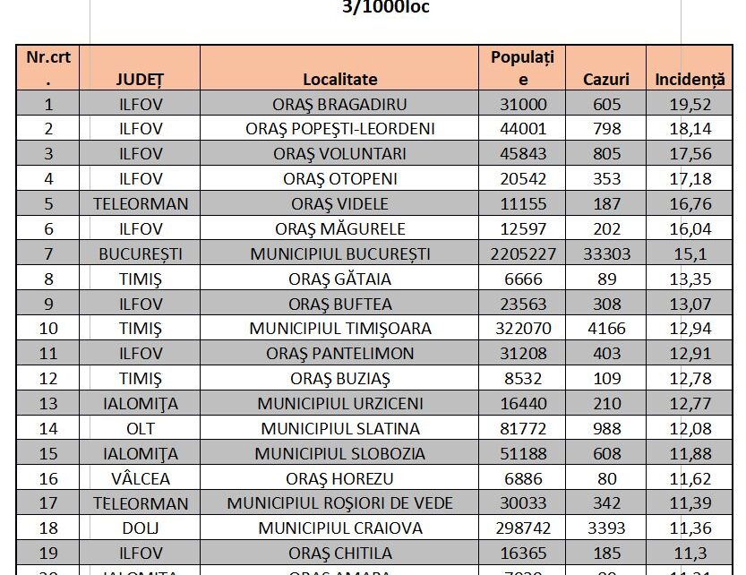 Lista completă a oraşelor şi localităţilor cu rată de infectare peste 3 la mia de locuitori în ultimele 14 zile poate fi consultată aici