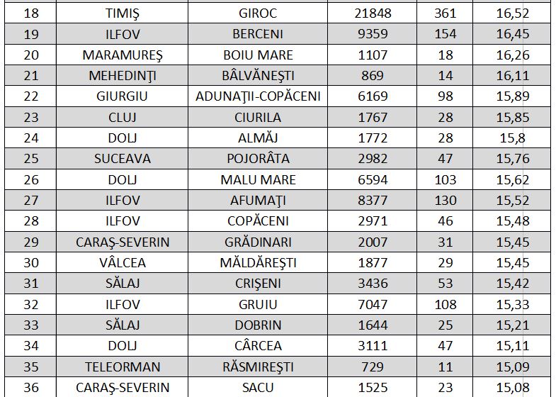 Lista localităţilor din România care au o rată de infectare peste 15 la mia de locuitori