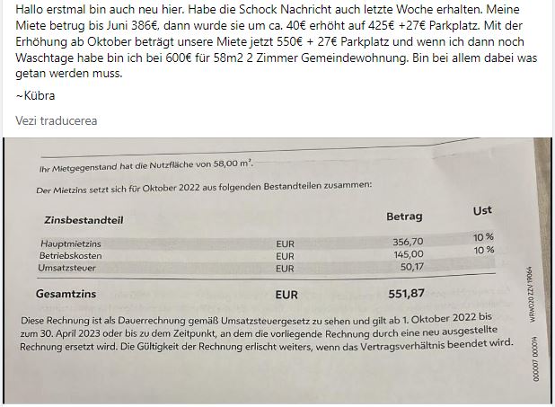 Iată una dintre postări, în care chiriașul pune o foto cu tarifele vechi și noi: ”Am primit și eu vestea șoc săptămâna trecută. Chiria mea a fost 386€ pana in iunie, apoi a crescut cu cca. 40€ majorat la 425€ +27€ loc de parcare. Cu creșterea din octombrie chiria noastră este acum 550€ + 27€ parcare și dacă mai am zile de spălat atunci sunt la 600€ pentru 58m2 condominiu 2 camere. Sunt acolo pentru tot ce trebuie făcut.